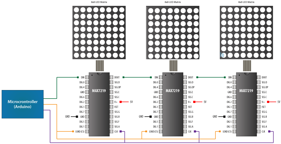 I 64 LED sono pilotati tutti dai 16 pin di uscita dell’IC. Come è possibile? Ebbene, il numero massimo di LED che si accendono contemporaneamente è in realtà otto. I LED sono disposti come un insieme di righe e colonne 8 × 8. Il drive MAX7219 si attiva per ogni colonna solo per un periodo di tempo molto breve e allo stesso tempo accende in sequenza tutte le righe. Grazie all’effetto di permanenza delle luce sulla retina, i nostri occhi noteranno solamente una luce continua.